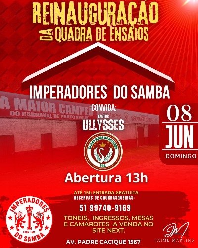 Venha participar deste momento tão especial. Reinauguração da nossa quadra de ensaios, com nova cobertura. Será no dia 08 de junho, com convidados muito especiais: Ullysses, e o tão esperado reencontro com a escola de samba Estado Maior da Restinga, e é claro, o grupo show de Imperadores do Samba.
